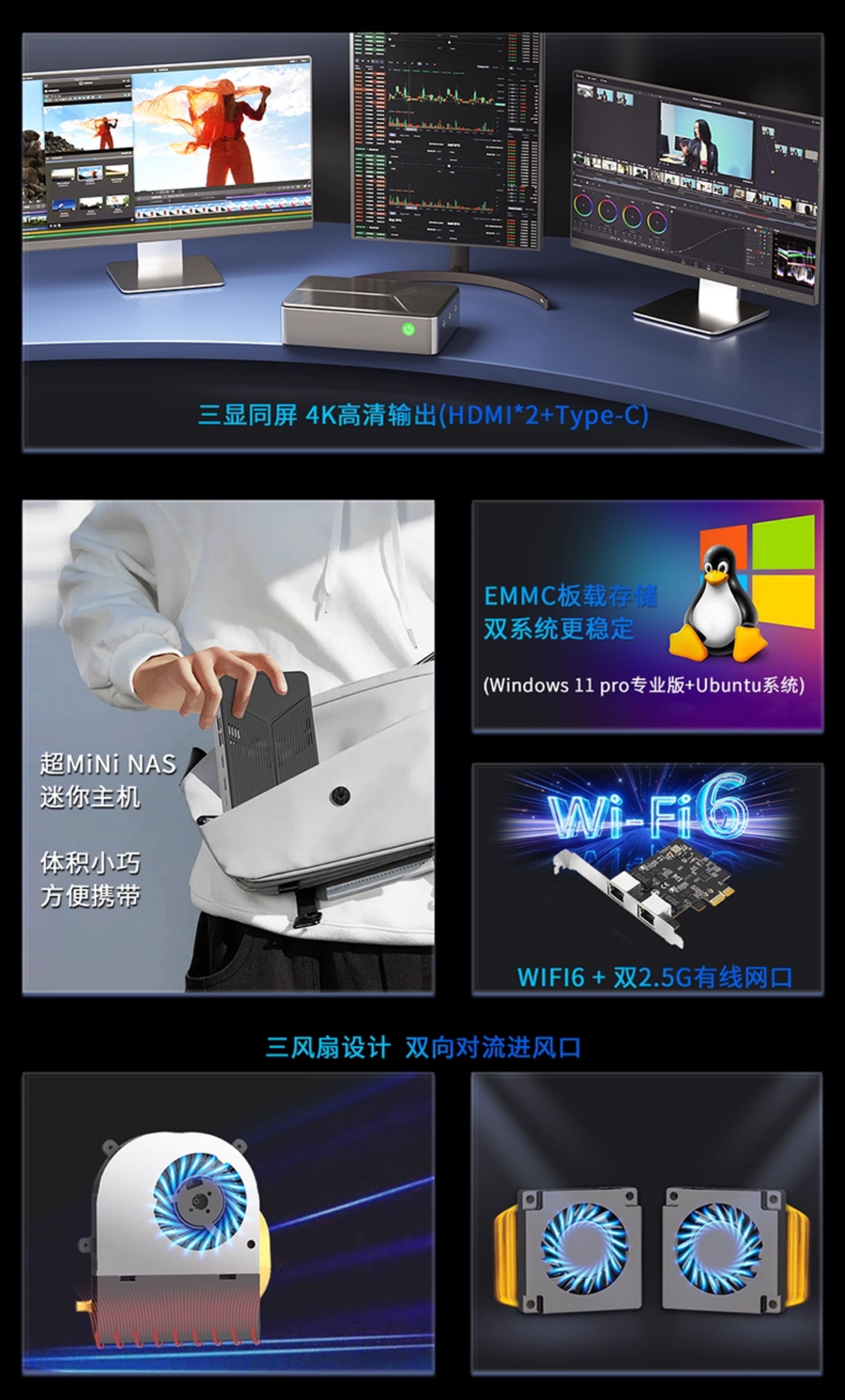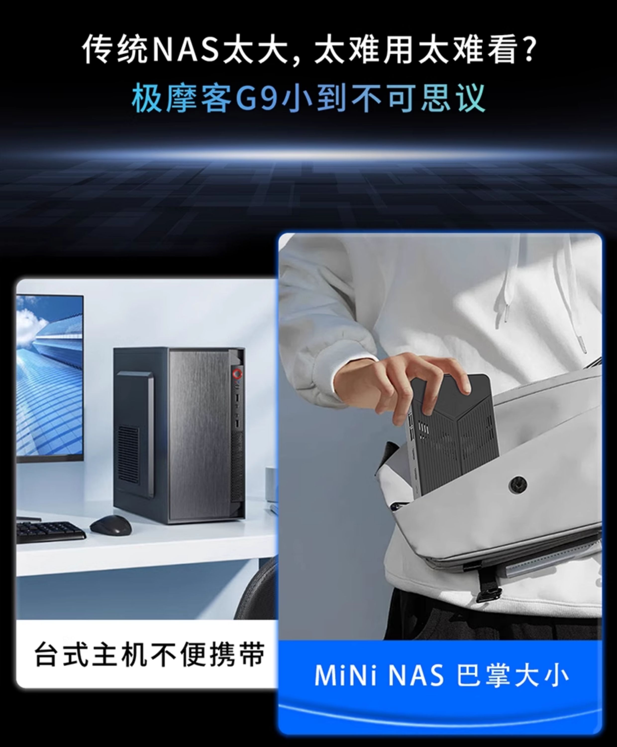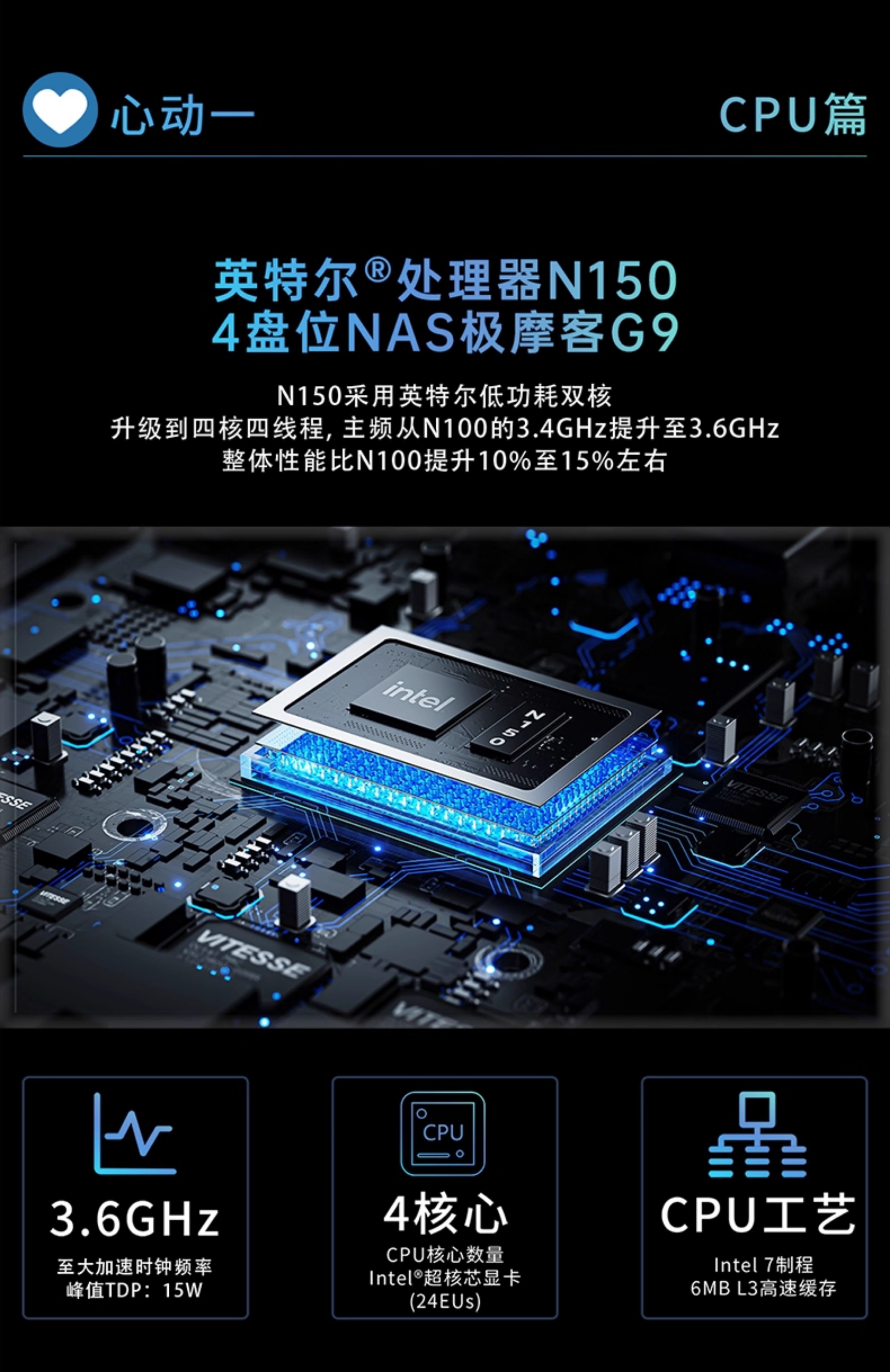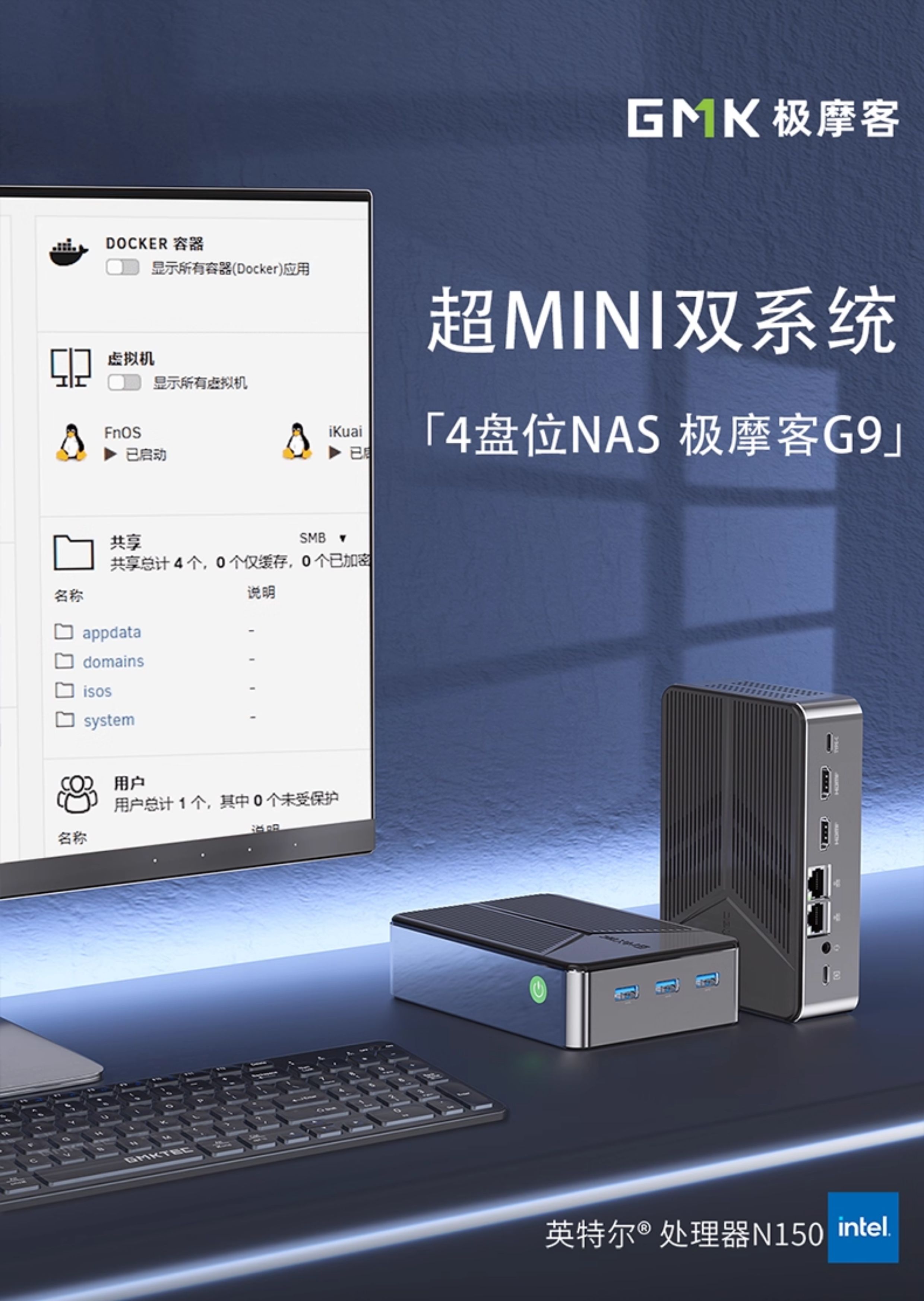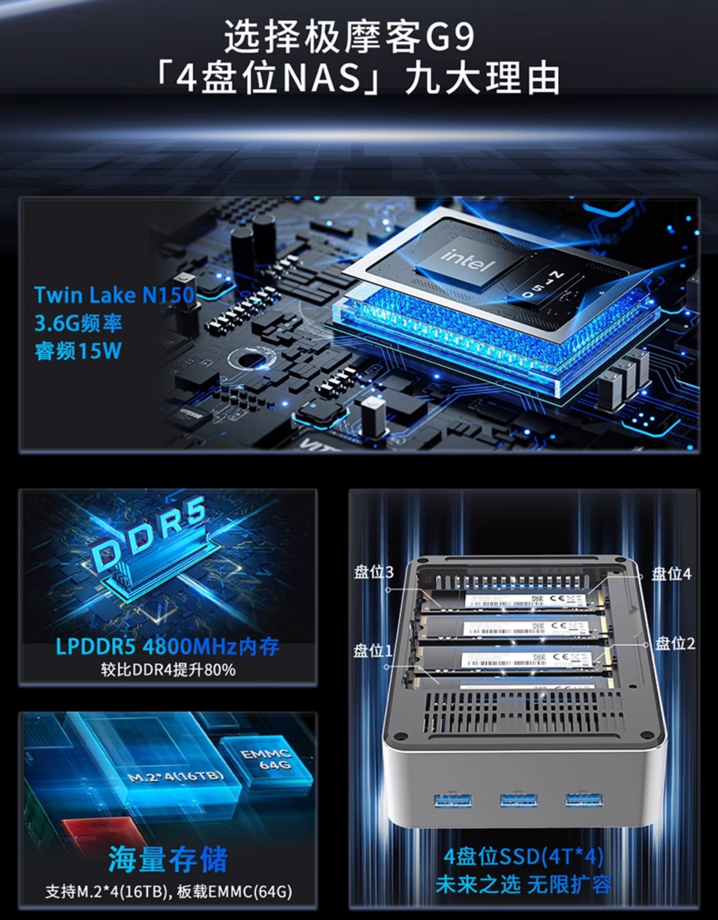 极摩客G9 NAS迷你主机英特尔N150 四硬盘位 双2.5G网口 家庭网盘DIY可存储16T 12G+64+0(预装Ubuntu系统)