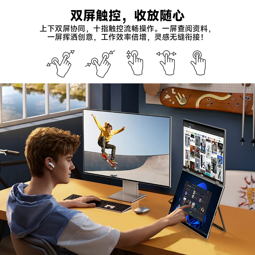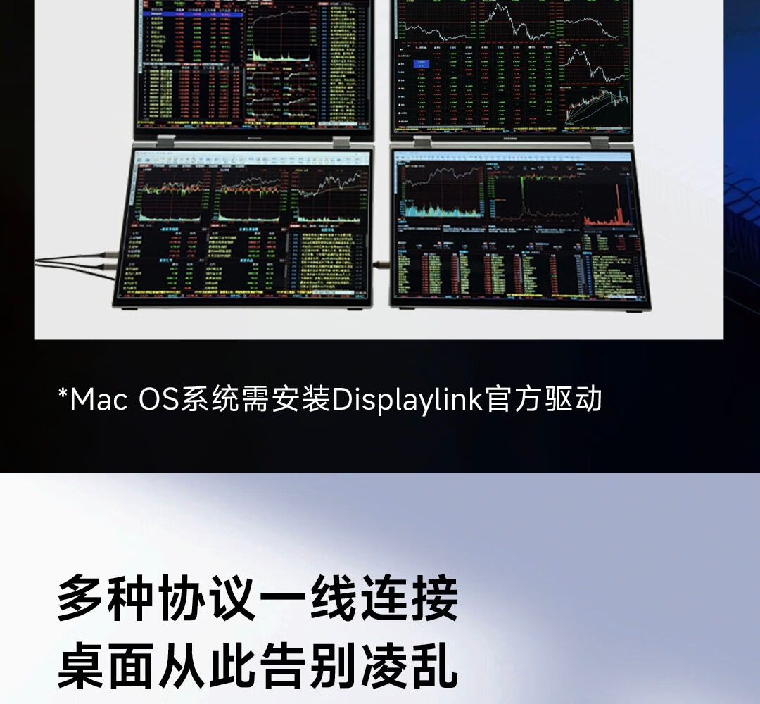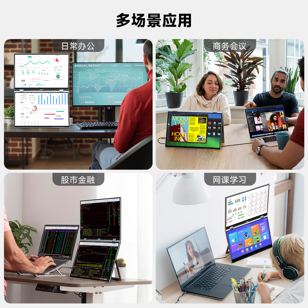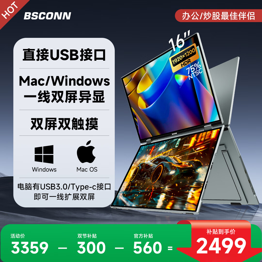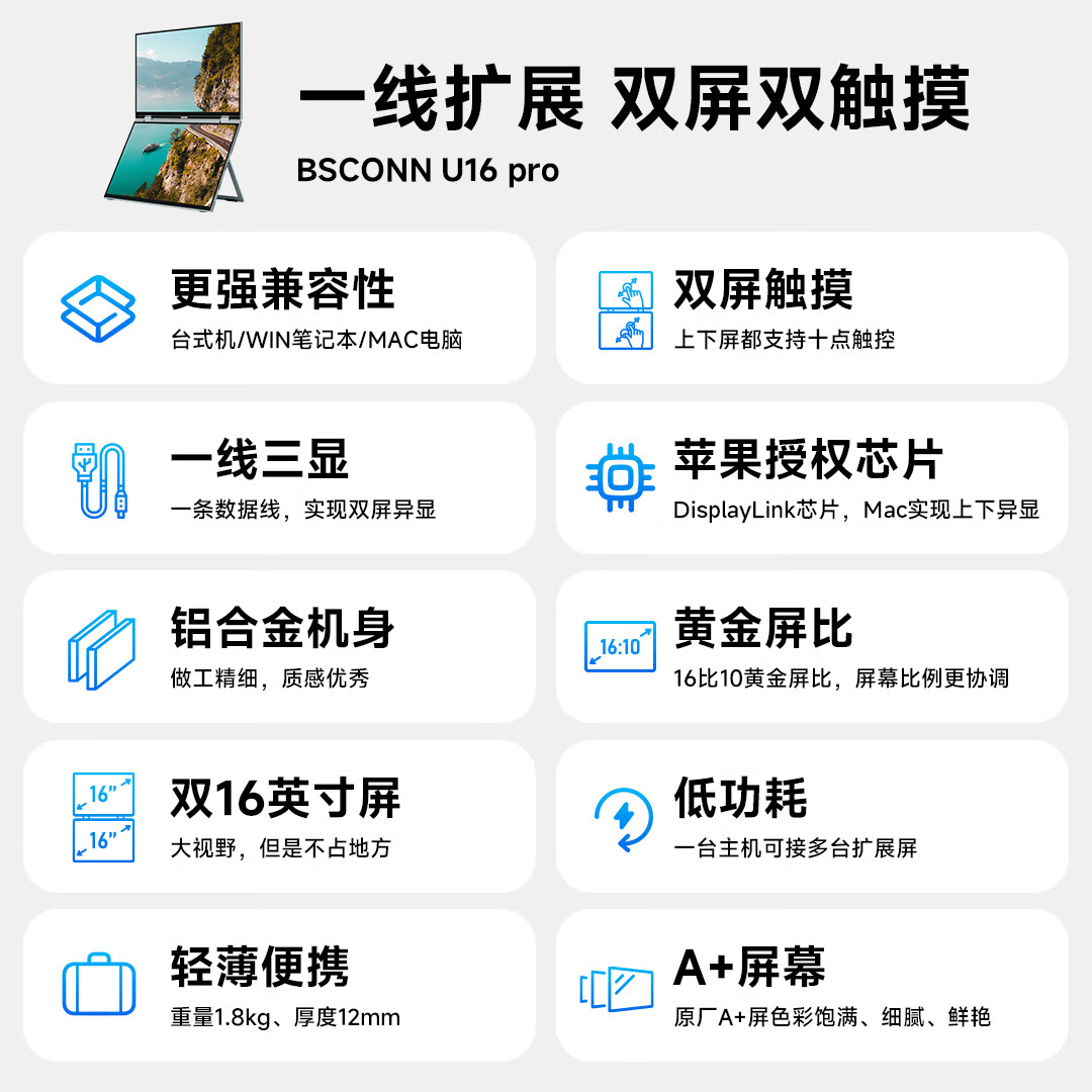 BSCONN U16 PRO 双16寸便携屏显示器 mac电脑拓展屏 台式机扩展屏 笔记本副屏 USB/Type-C 一线三显 A+屏 银色 兼容(苹果/Win台式机/笔记本) 苹果displaylink芯片(办公/股票/家用)